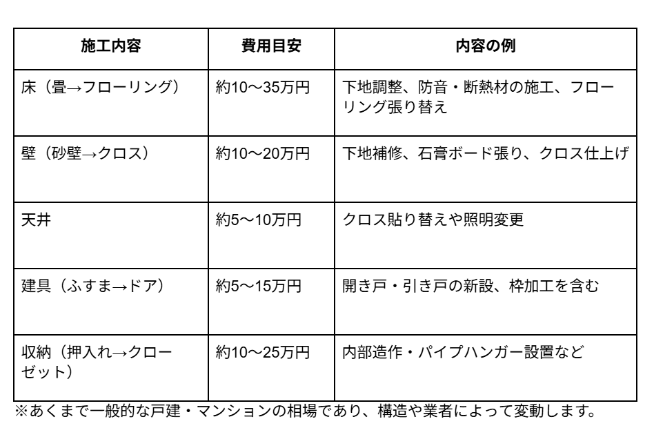 6畳〜8畳程度の一般的な和室を洋室に変更する場合、総額30〜80万円前後が目安です。