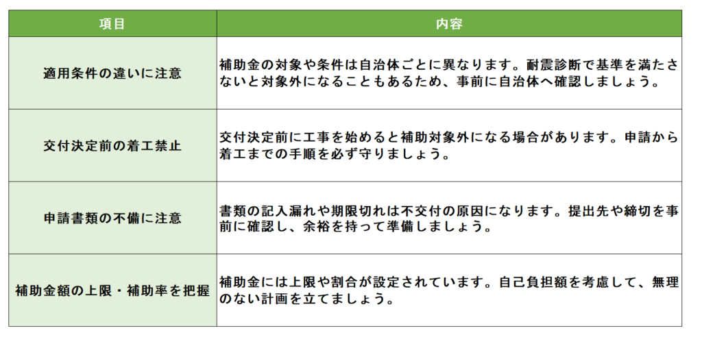 このように、自治体ごとに補助率、限度額、対象となる住宅の条件、施工業者の要件などが異なるため、自治体の公式ウェブサイトで詳細を確認・相談することが重要です。